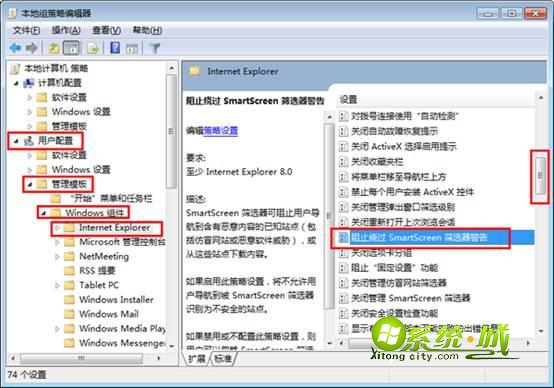 2、在打开的本地组策略编辑器中,依次进入“用户配置” — “管理模块” — “windows组件” — “internet explorer”,在右边窗口中下拉滚动条,找到并双击“阻止绕过smartscreen筛选器警告”选项;